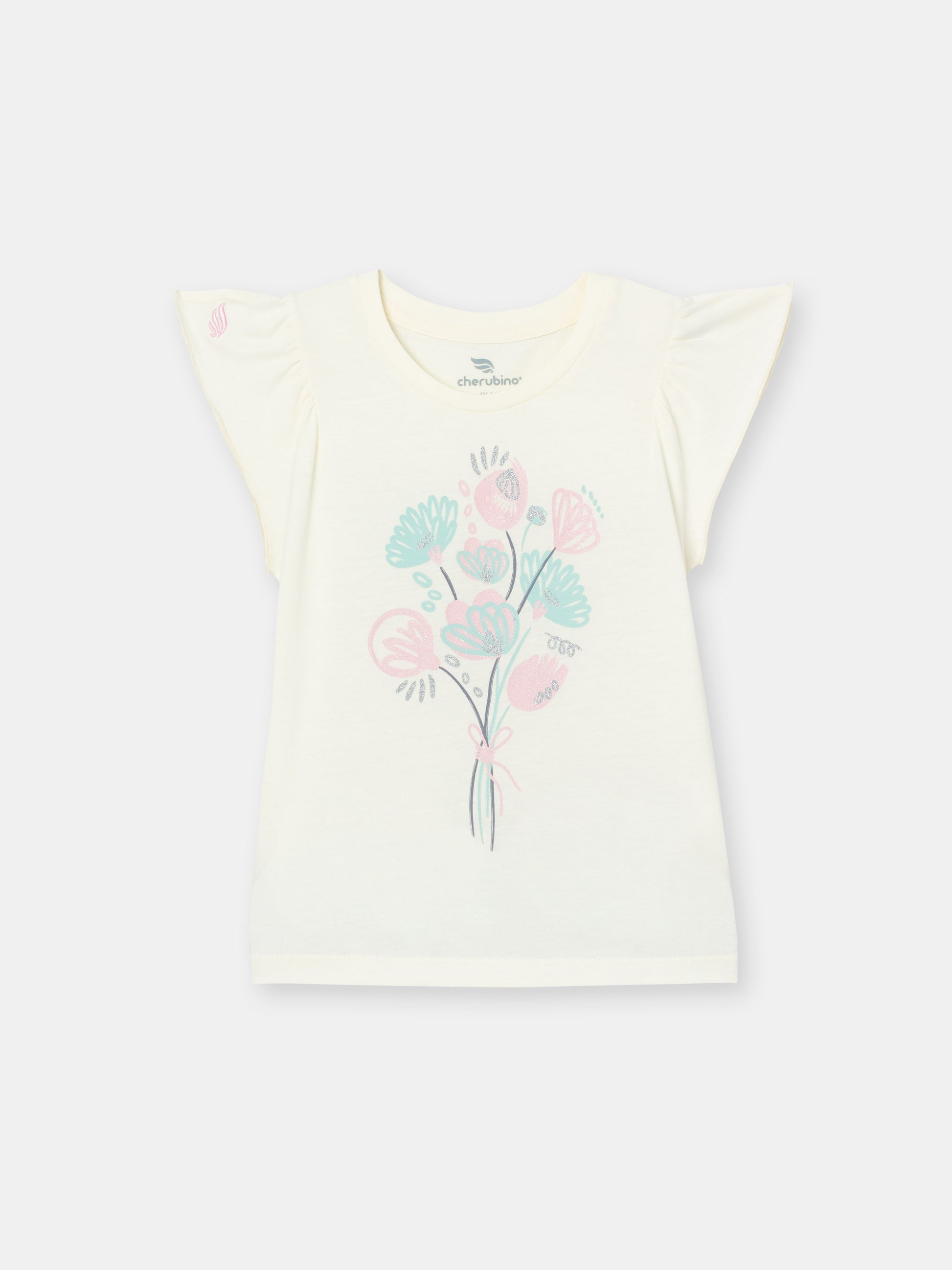 Cherubino Girls' Flutter Sleeve Floral Bouquet Tee in Ecru